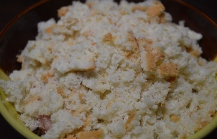 4Батон размачиваем в воде и крошим.