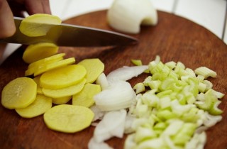 3Тем временем сельдерей нарезаем кубиками, картофель кружочками, а половину лук - полукольцами.