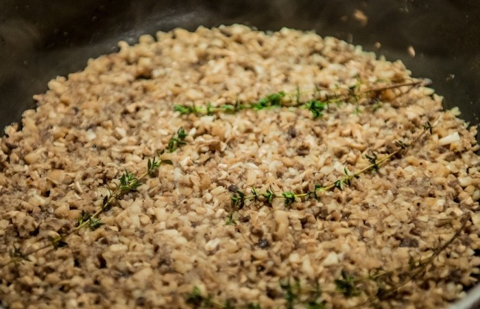 3Грибы пропускаем через мясорубку и обжариваем на сковороде с добавлением соли и перца в течение нескольких минут. Затем вливаем вино и добавляем веточки тимьяна, готовим до испарения жидкости.