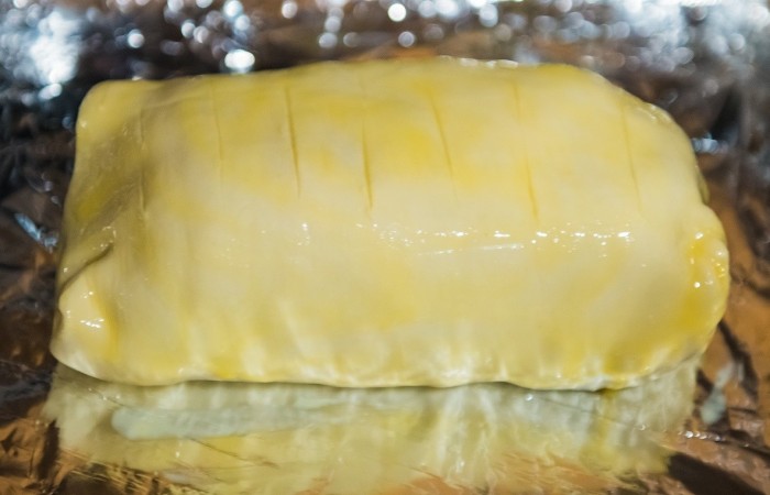9Смазываем тесто взбитым желтком, делаем надрезы и заворачиваем в фольгу. Отправляем в духовку на 15-20 минут, предварительно разогретую до 180 градусов.