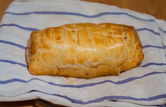 8Заворачиваем получившуюся в конструкцию (предварительно сняв пленку) в один пласт раскатанного слоеного теста.