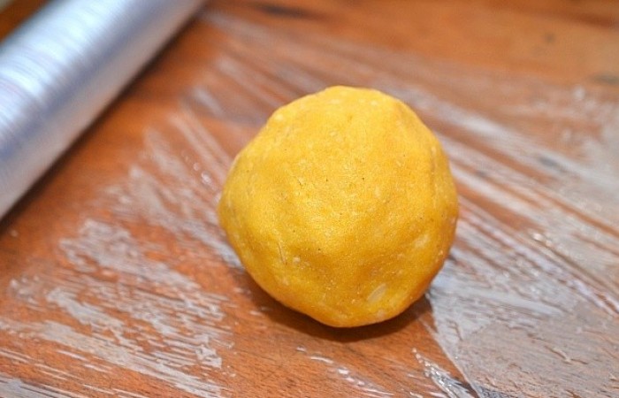 4Тщательно все перемешиваем и замешиваем однородное тесто. Скатываем его в шар. Заворачиваем в пищевую пленку и отправляем в холодильник на полчаса.