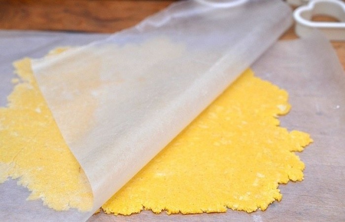 5Затем раскатываем тесто в тонкий пласт толщиной примерно 5 мм между двумя листами пергамента. Таким образом тесто не будет липнуть к скалке и рукам.
