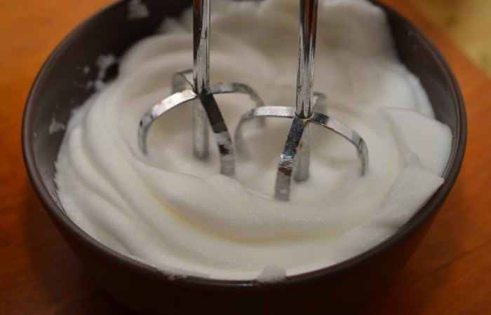 5Взбиваем белки до твердых пиков с помощью миксера.