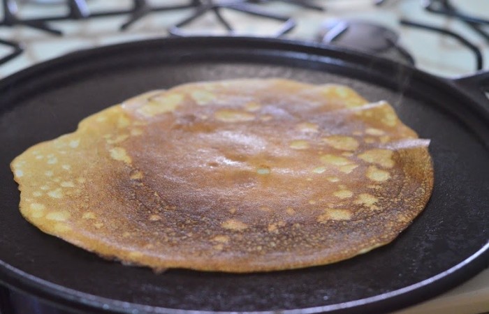 10Часть теста выливаем на раскаленную и смазанную маслом сковороду. Распределяем по всей поверхности.