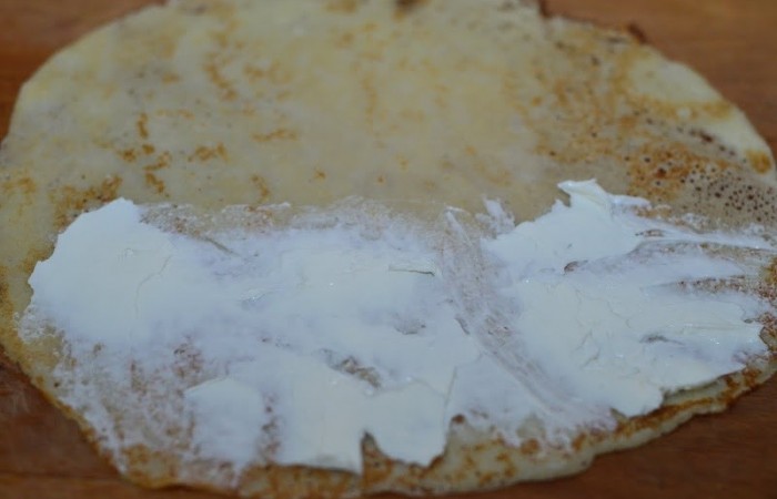 17Делаем сладкий вариант бличника. Половину блина смазываем сыром.