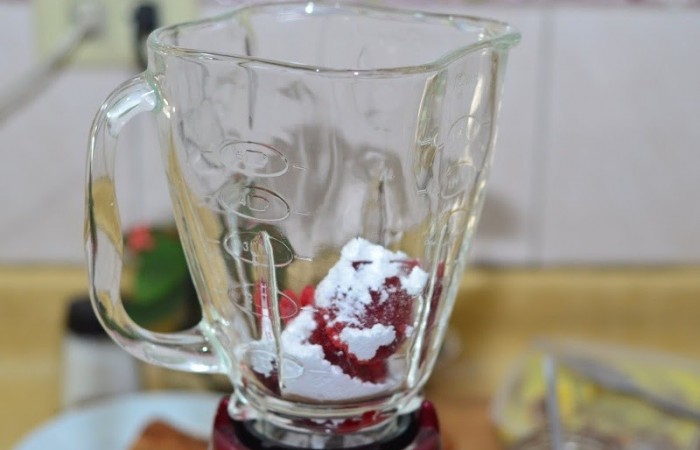 21Для соуса взбиваем клубнику с сахарной пудрой.