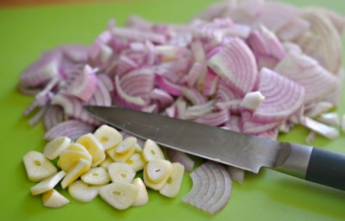 2Чеснок с луком нарезаем небольшими пластинами.