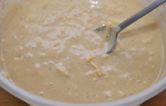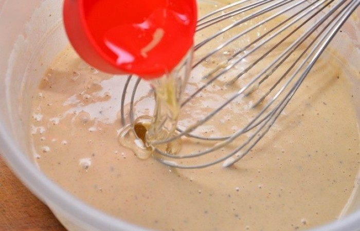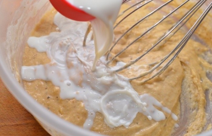 7Сухую смешиваем с яйцами и вливаем молоко. Тщательно перемешиваем.