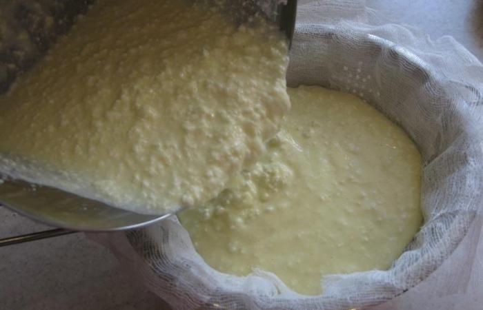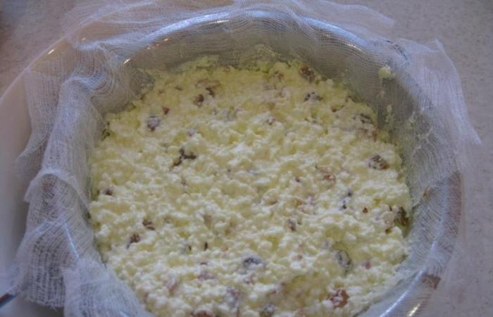 4Перекладываем творожную массу в другую емкость, застеленную марлей.