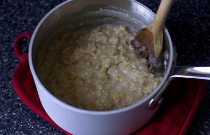 1Овсяные хлопья (1 стакан) выкладываем в кастрюлю, заливаем водой и отвариваем около 5-7 минут. В процессе варки добавляем щепотку соли.