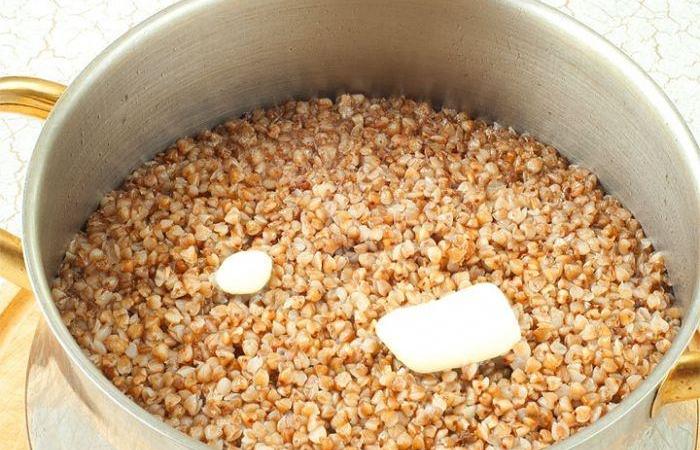 4Варим гречку до испарения жидкости. Добавляем сливочное масло.